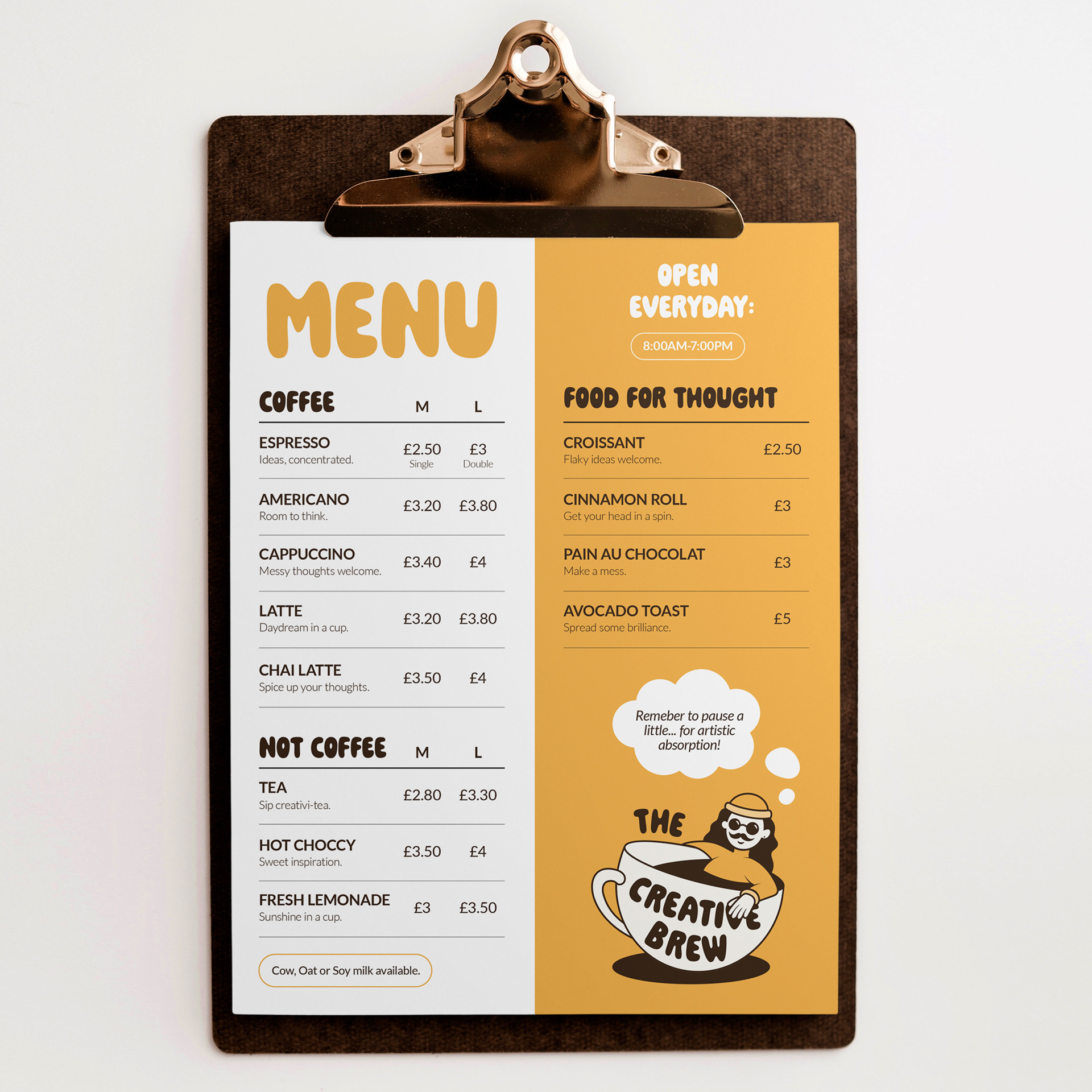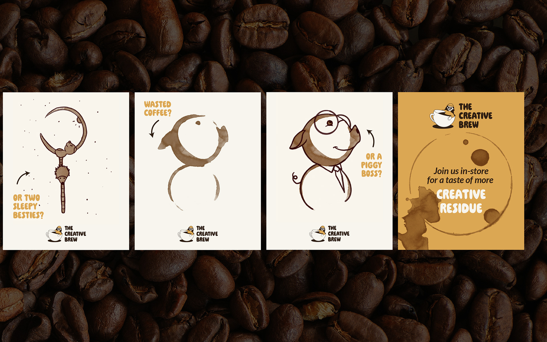 The logo for The Creative Brew is a character inspired by the “stereotypical artist,” reflecting the cafe’s target audience and playful spirit. A hand-drawn typeface pairs with the illustration, reinforcing that this is a space for making and creating. Multiple logo variations ensure flexibility across different contexts, whilst a bold, punchy yellow colour palette helps the brand stand out from competitor cafes.